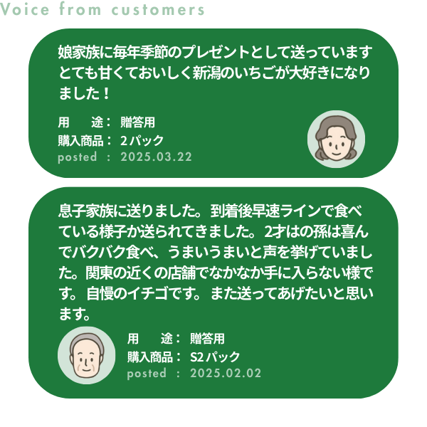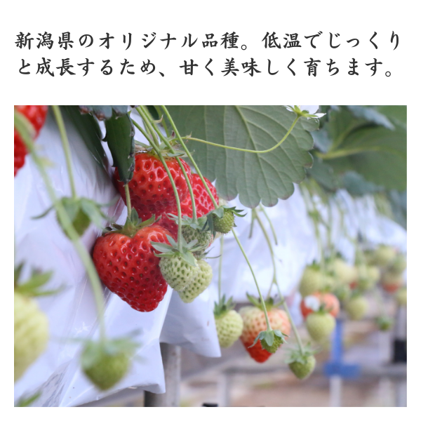 娘家族に毎年季節のプレゼントとして送っています とても甘くておいしく新潟のいちごが大好きになりました!
